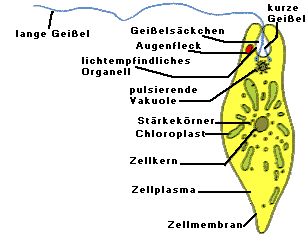 - ein roter Augenfleck und eine pulsierende Vakuole, die sich am Kopfende der Euglena befinden